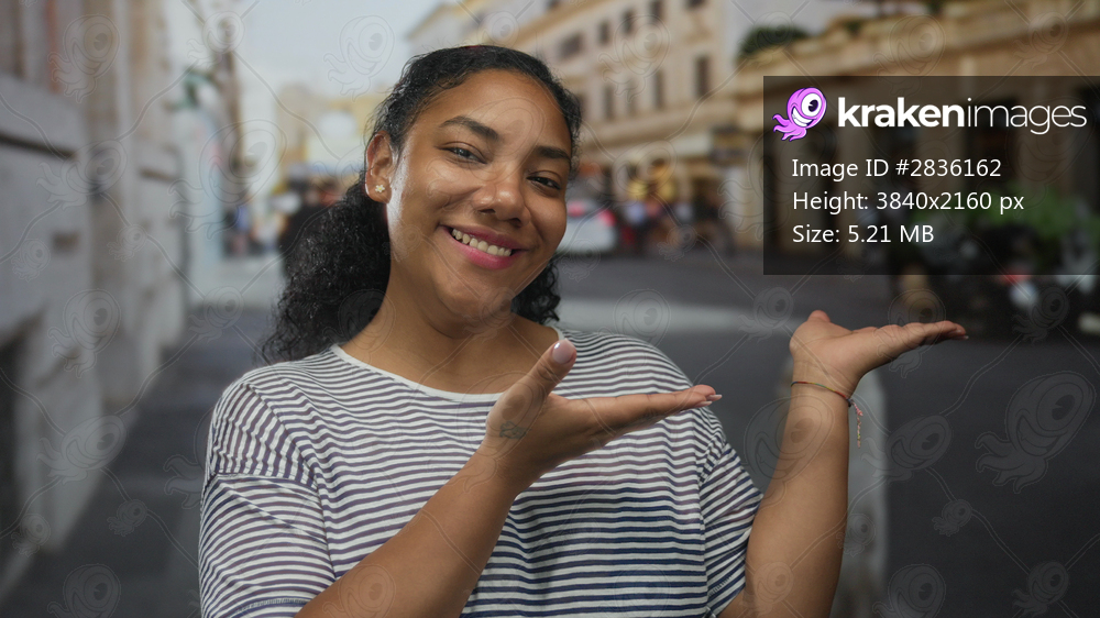 African american woman in striped shirt smiles and gestures with open palms on street; cheerfulness.