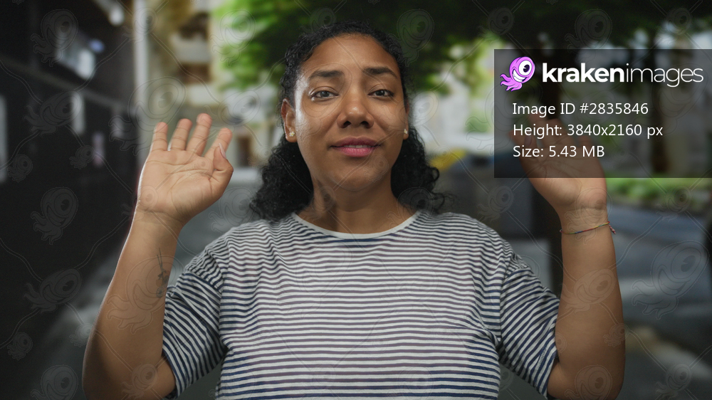 African american woman in striped shirt waving both hands in a bustling city street; friendly greeting connection warmth.