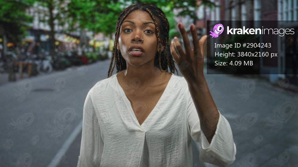 African american woman in white blouse with braided hair beckons with hand and stands arms crossed on a city street; frustration confrontation.