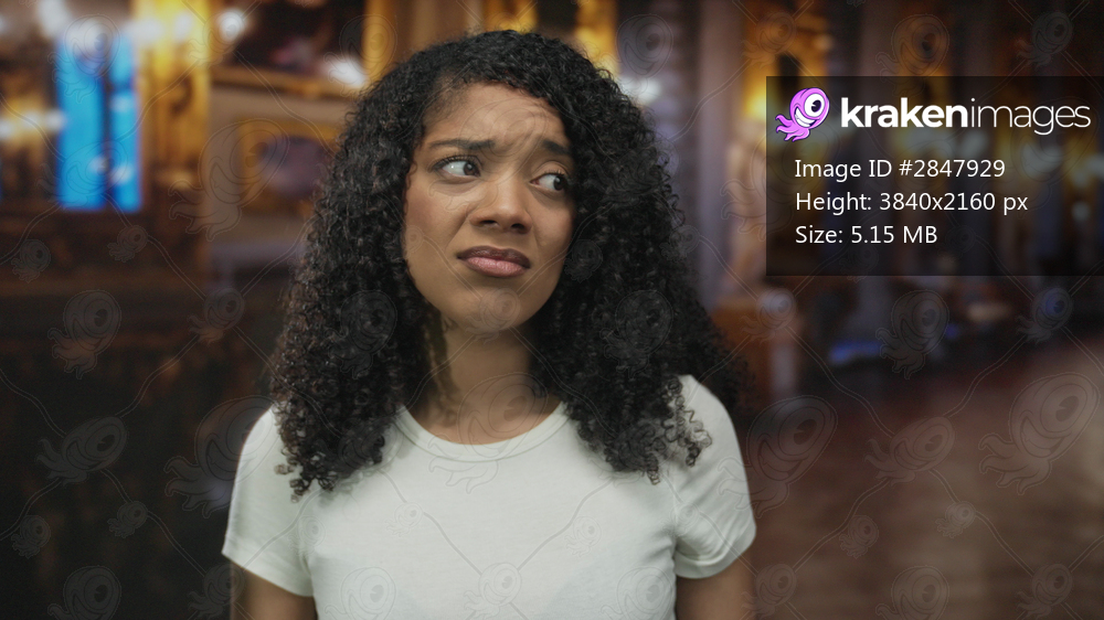 African american woman in white shirt furrows brow in museum building; uncertainty doubt tension concern.