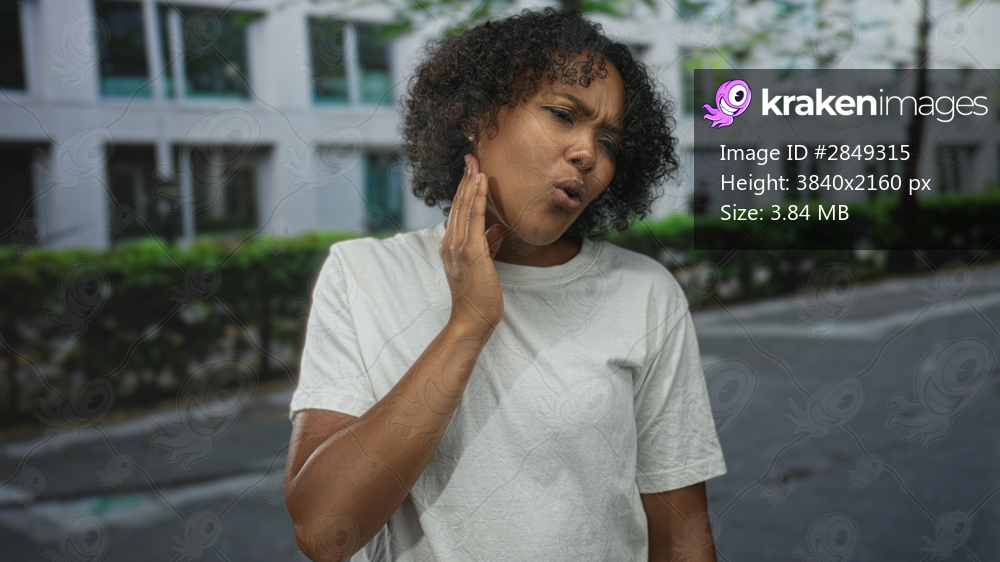 African american woman in white tshirt pressing cheek against building facade on street pavement; discomfort.
