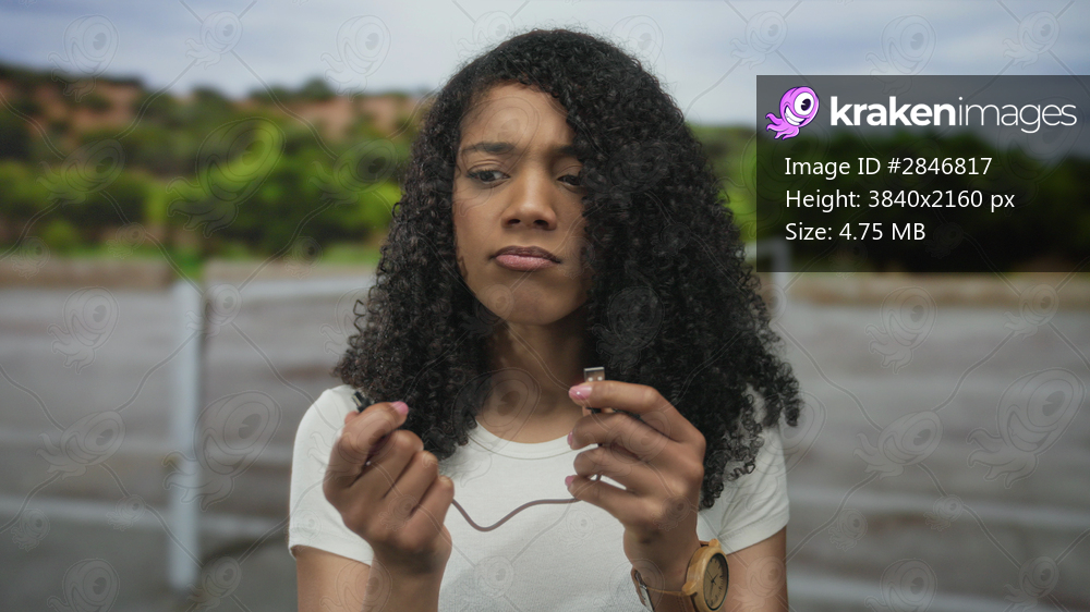 African american woman inspects a frayed cable under a forest canopy while standing by a wooden railing; tech problem frustration.