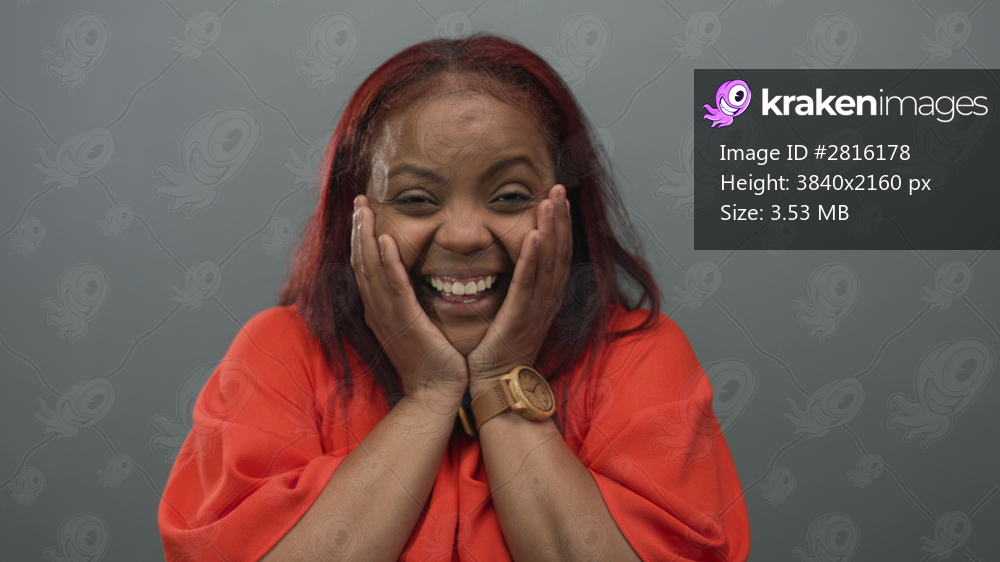 African american woman laughs joyfully holding her hands to her cheeks in a gray studio portrait session; joy.