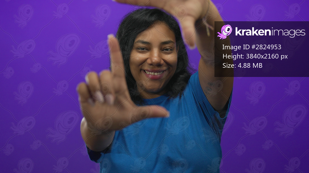 African american woman makes framing gesture with hands while smiling in studio wearing blue shirt; creativity joy.