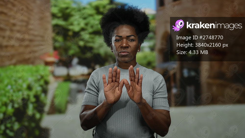 African american woman outdoors making a rejecting gesture on a city street with greenery, expressing disapproval, emphasizing gesture and outdoor setting vividly. - Kraken Images