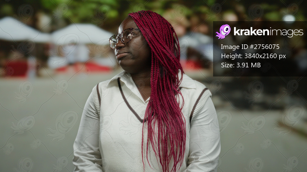 African american woman with pink braids and glasses stands outdoors on a city street, displaying a thoughtful expression in urban scenery with blurred crowds. - Kraken Images