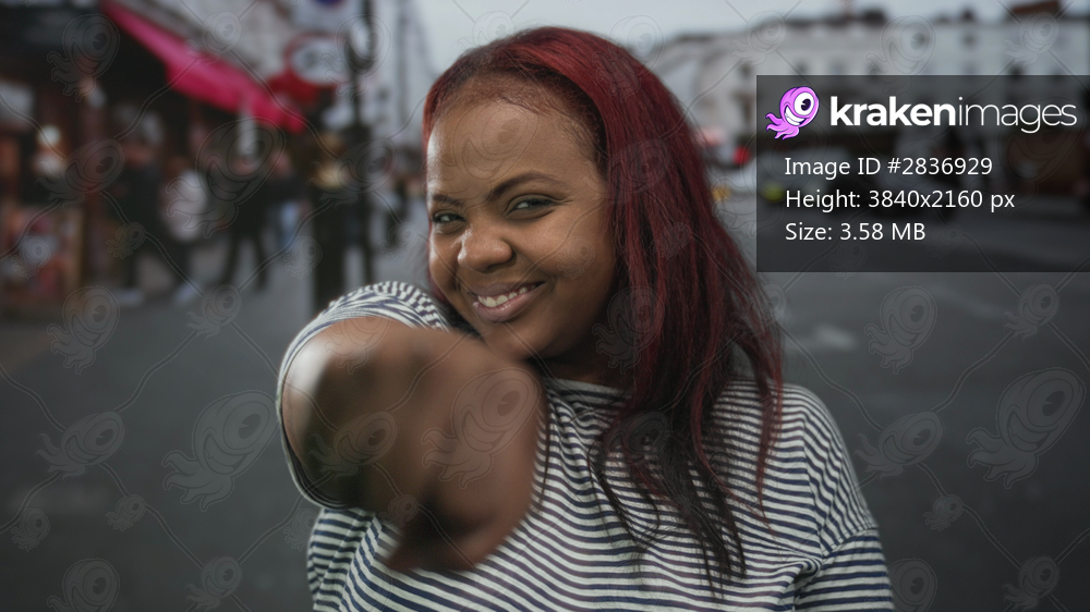 African american woman places fist to chest on busy street amid blurred buildings; solidarity empowerment.