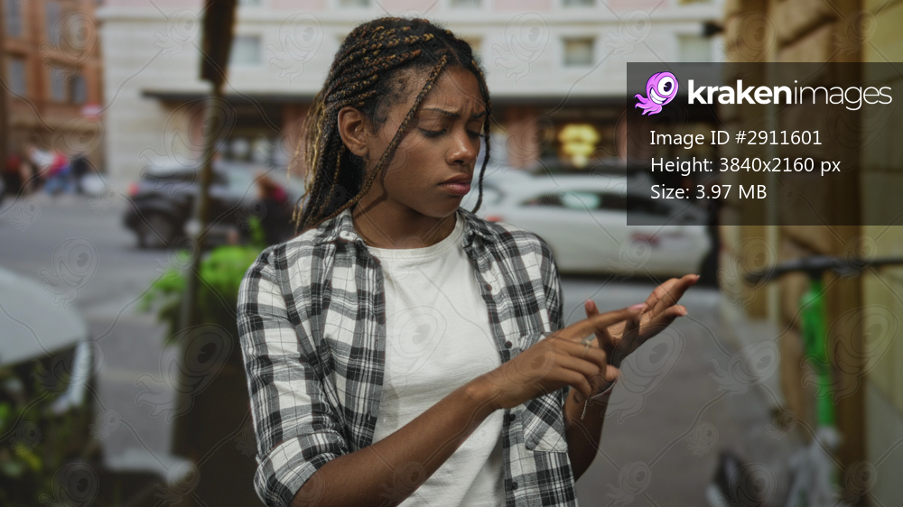 African american woman pointing at her hand while counting fingers on a busy city street with cars and buildings; confusion counting.