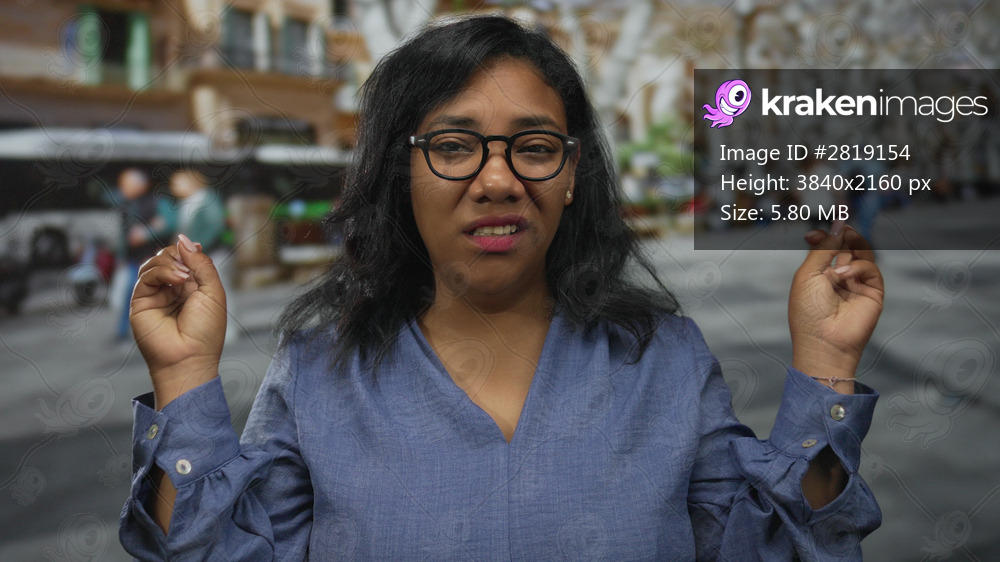 African american woman pointing both index fingers firmly on busy bustling downtown street; skepticism.