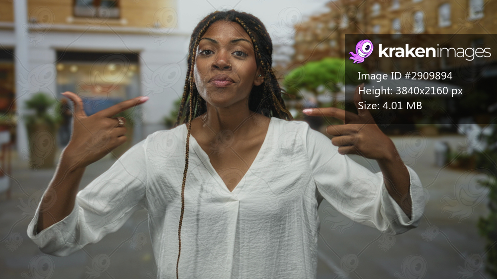 African american woman pointing to chest with fingers on a pedestrian street plaza near outdoor cafe and planters; confidence self assertion.