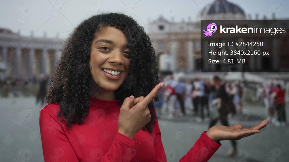 African american woman points finger at crowd beside vatican building; spiritual exploration wonder.