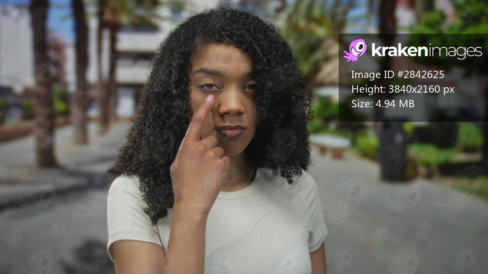 African american woman points finger to camera on a street in a green park with a serious stare; confidence determination poise.