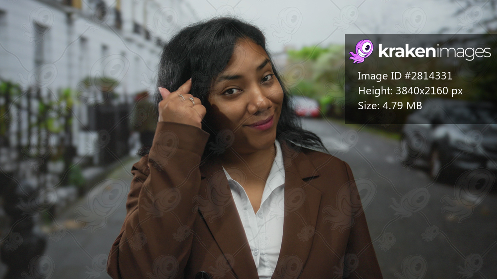 African american woman points finger to head in front of building on street; confidence creative thinking mindset.
