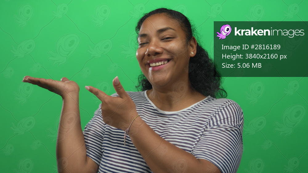 African american woman points finger to open palm against green backdrop in studio; offering optimism.