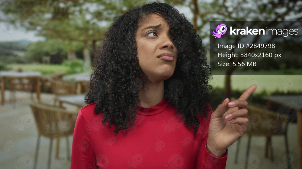 African american woman points finger to red shirt with skeptical frown on restaurant terrace under sunlight; doubt.