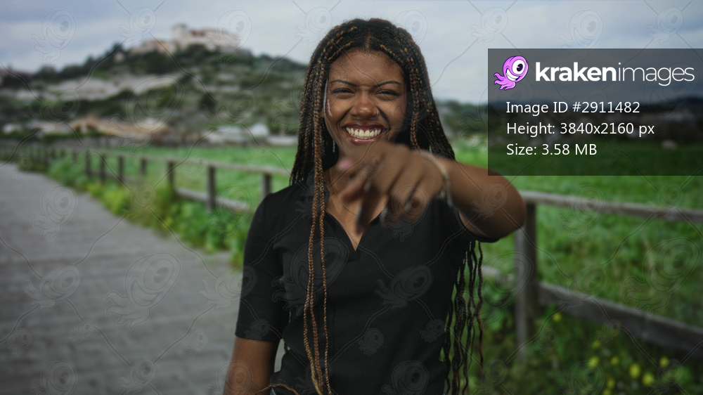 African american woman points finger toward camera on street walkway in green countryside field; joy confidence.