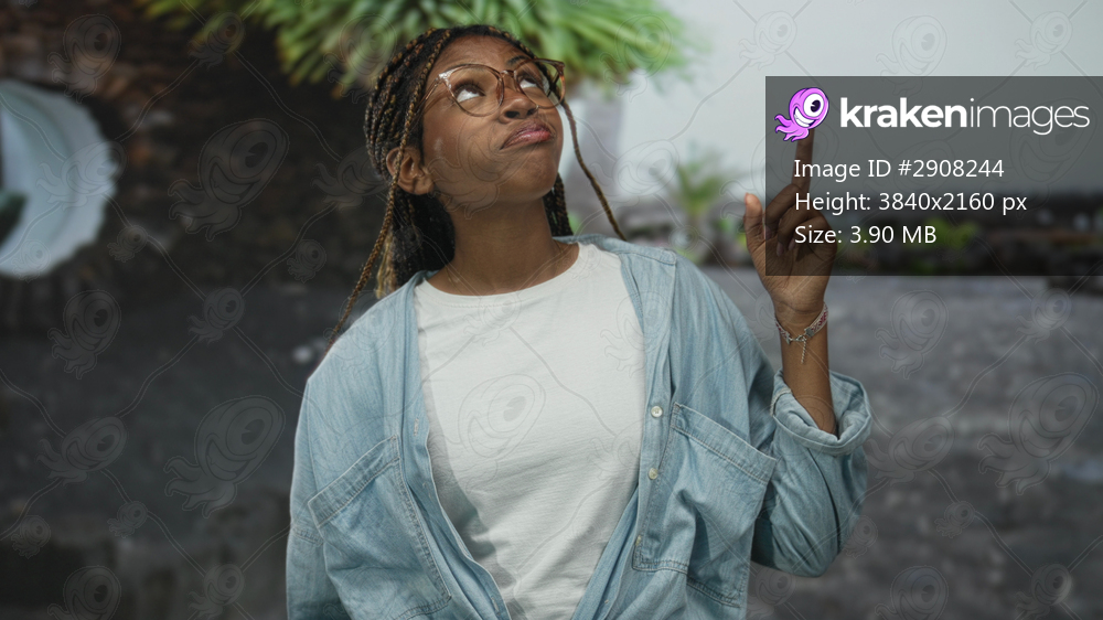 African american woman points finger up on street while smiling, wearing glasses and denim shirt; confidence empowerment.