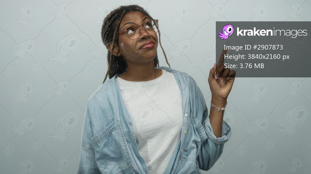 African american woman points finger upward in studio with pale blue backdrop and glasses, wearing denim shirt and white tee; joyful optimism.