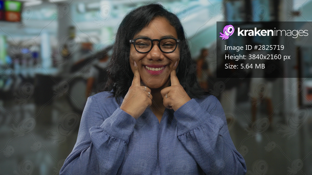 African american woman pressing index fingers into both cheeks while smiling in airport terminal; travel excitement.