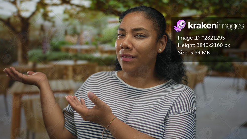 African american woman raising bare palms outside sunlit restaurant building with puzzled expression; uncertainty.