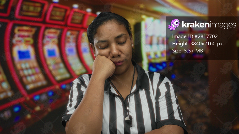 African american woman referee wearing striped shirt covers her mouth by slot machine in casino building; boredom.