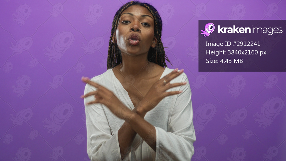 African american woman showing hands crossed over chest in studio with purple backdrop; defiance empowerment resolve.