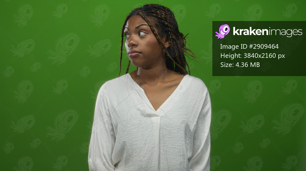 African american woman shrugs shoulders in green studio wearing a white blouse with braided hair and a nose ring; uncertainty doubt.