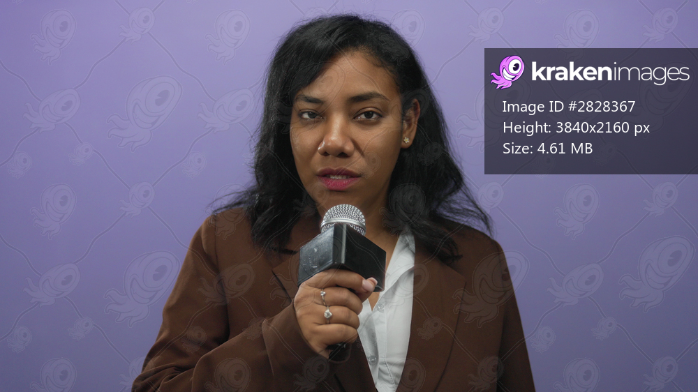 African american woman singing with closed eyes into microphone against purple background in studio; confidence.