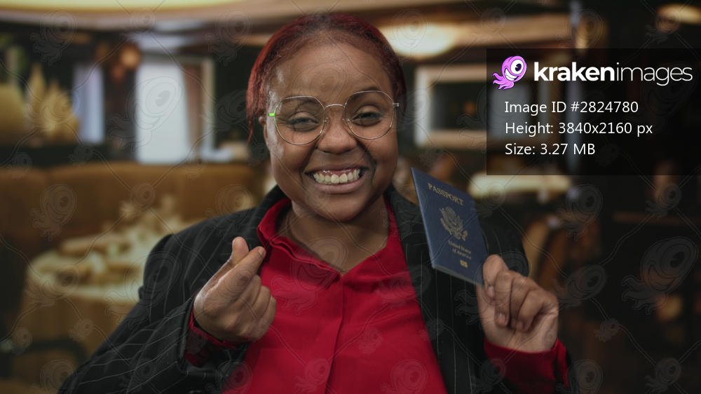 African american woman smiles and pinches fingers holding passport in restaurant; travel journey hope.