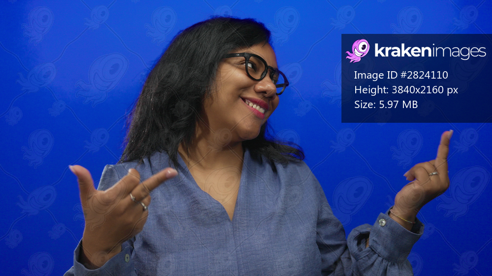African american woman smiles and shows middle finger in blue studio; insult defiance rebellion boldness.