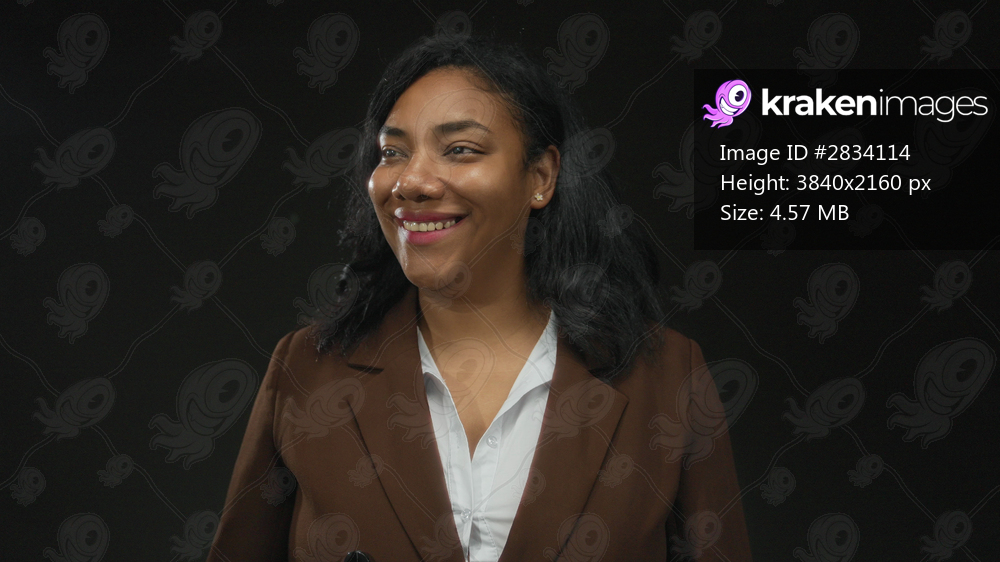 African american woman smiles wearing brown blazer and white shirt in studio; confidence optimism warmth joy.
