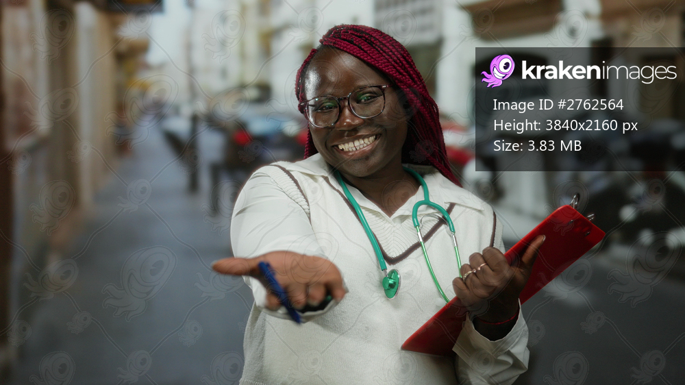 African american woman smiling with a stethoscope and clipboard reaching out on a busy city street.
