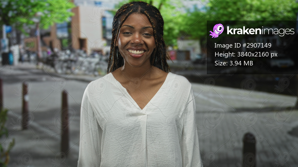 African american woman smiling with closed eyes in a white blouse on a city street by a canal and bicycles; joy.
