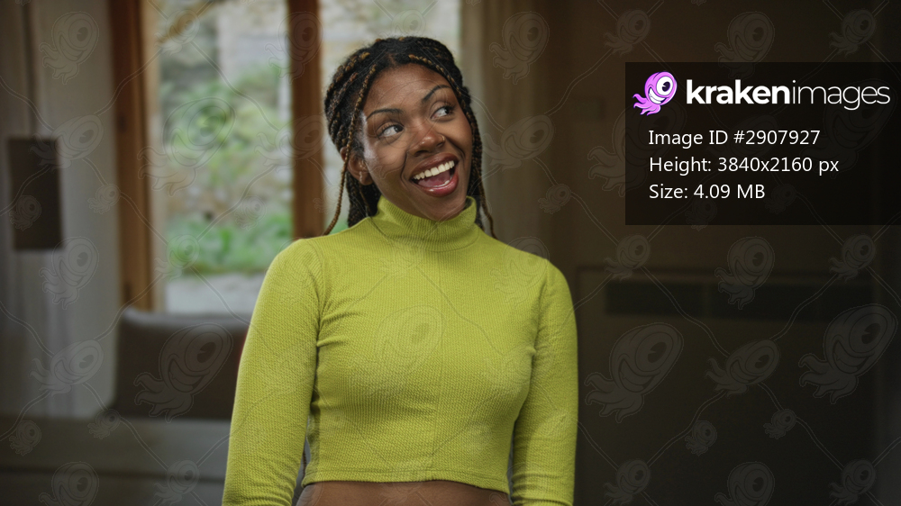 African american woman smiling with eyes closed, head tilted and laughing in a studio, wearing a cropped lime green top showing midriff; joy confidence. - Kraken Images