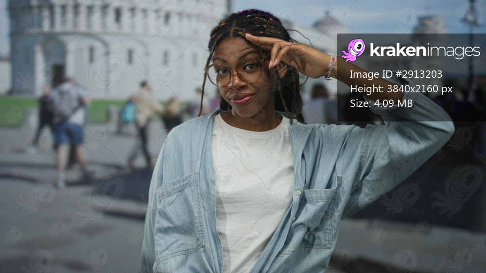 African american woman smiling, hand raised in a wave at a building near the pisa tower, wearing glasses and denim shirt; travel happiness.