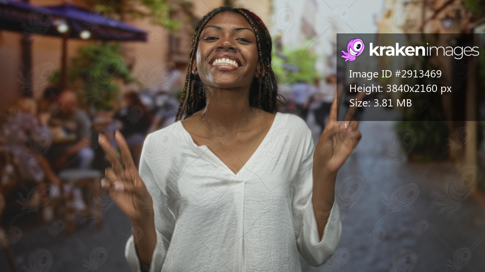 African american woman smiling and holds up peace signs on a street terrace with braids and nose ring; joy carefree.