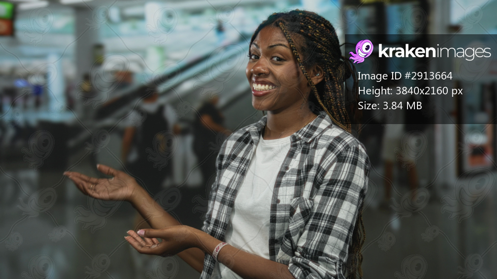 African american woman smiling with palms up presenting at airport terminal; travel welcome arrival joy.
