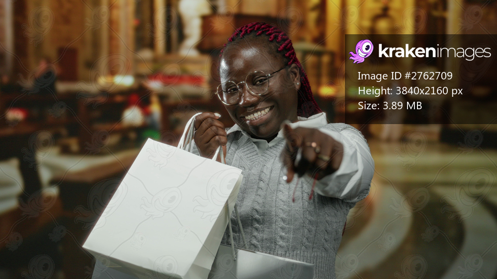 African american woman smiling and pointing while holding shopping bags inside a church, reflecting joy and the contrast of shopping in a sacred environment. - Kraken Images