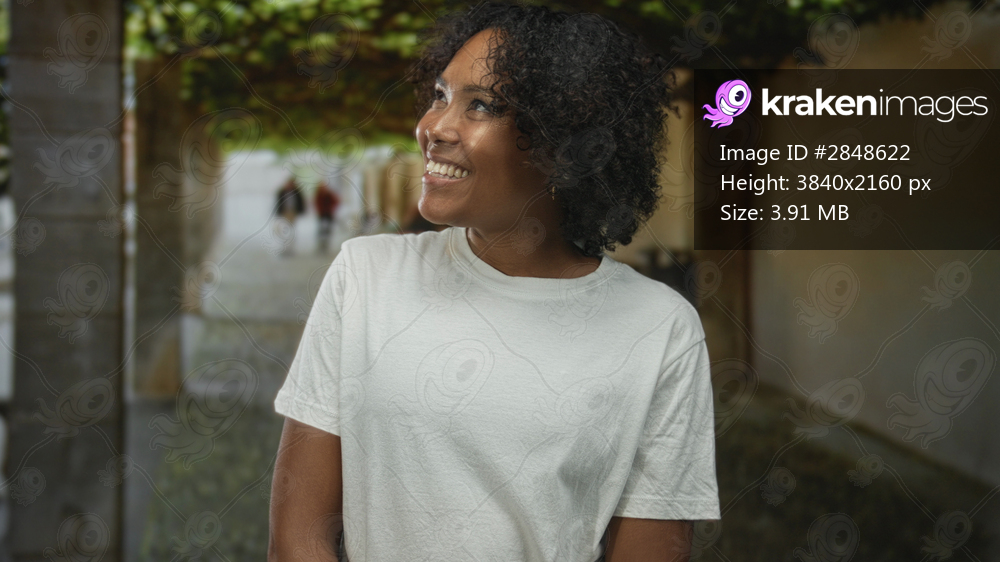 African american woman smiling showing teeth in white shirt on street; happiness optimism warmth confidence.