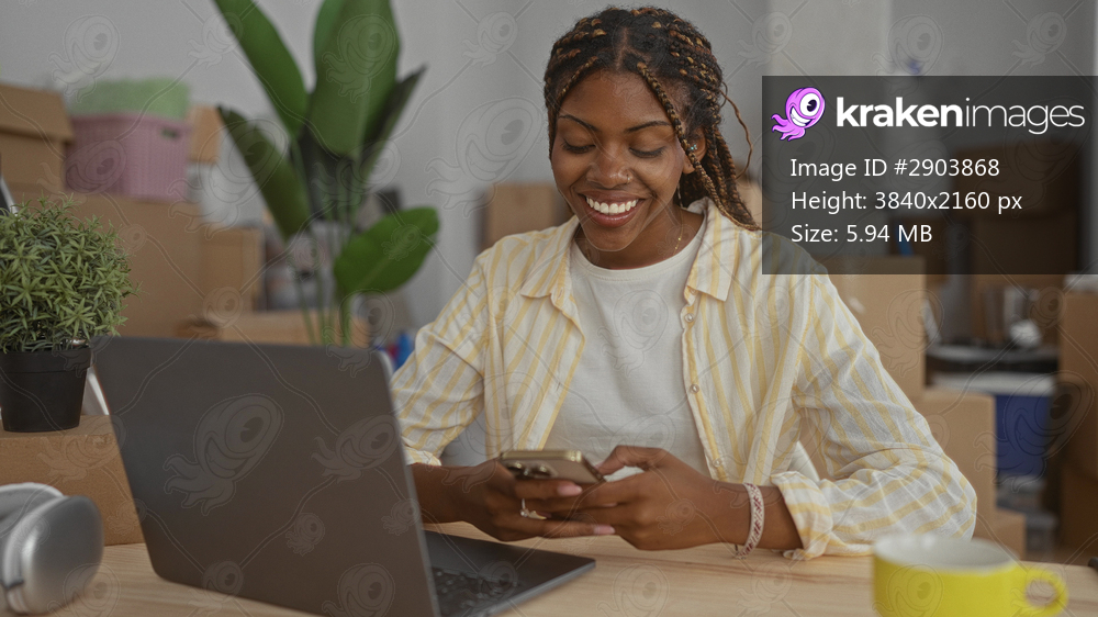 African american woman smiling and typing with hands on phone and laptop in building with moving boxes; small business startup happiness.