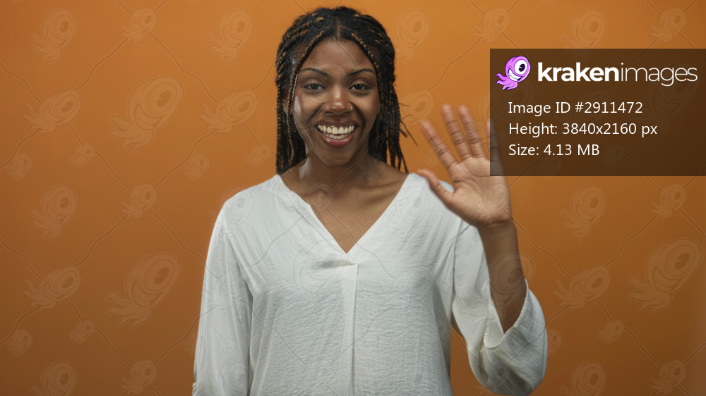 African american woman smiling and waving hand in orange studio, wearing white blouse and braided hair, facing camera with nose ring; warmth welcome.