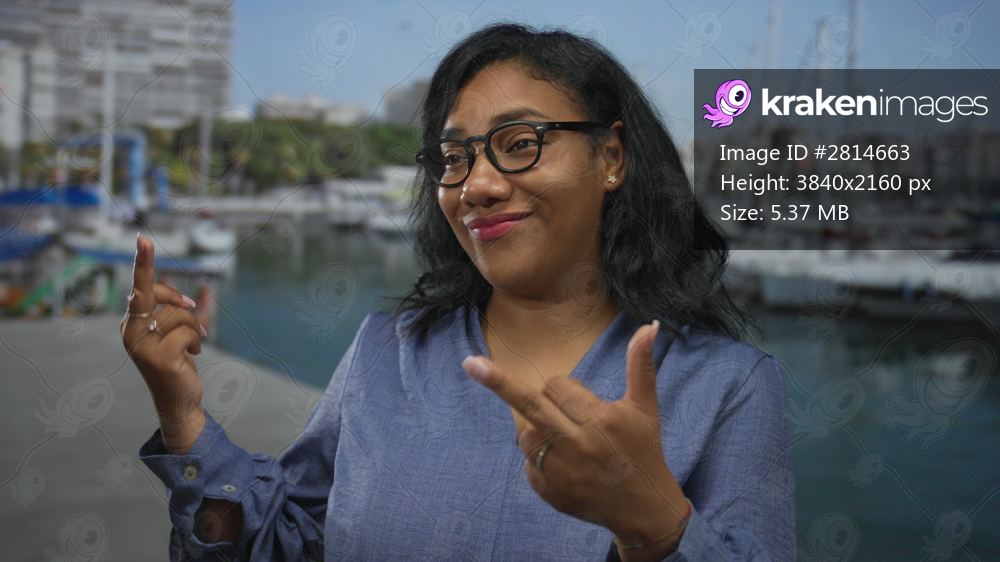 African american woman smiling wearing blue shirt shows middlefinger near boat and building; rebellious.