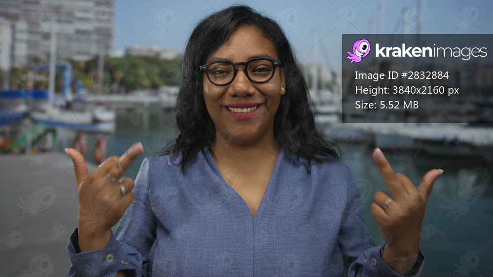 African american woman smiling wearing blue shirt shows middlefinger near boat and building; rebellious.