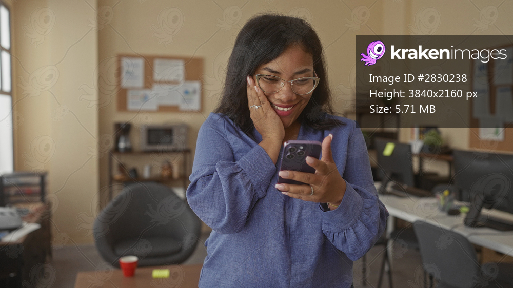 African american woman smiling while tapping smartphone at wooden desk inside office building with computer monitors and cup; personal joy.