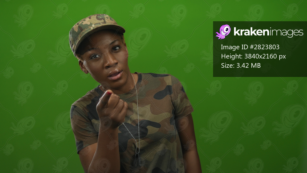 African american woman soldier wears camo cap and dogtag, points finger in studio with serious gaze; determination.