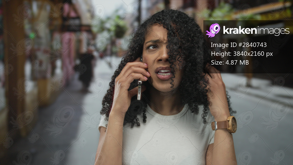 African american woman speaking angrily on smartphone on busy city street with storefronts and blurred passersby; frustration.