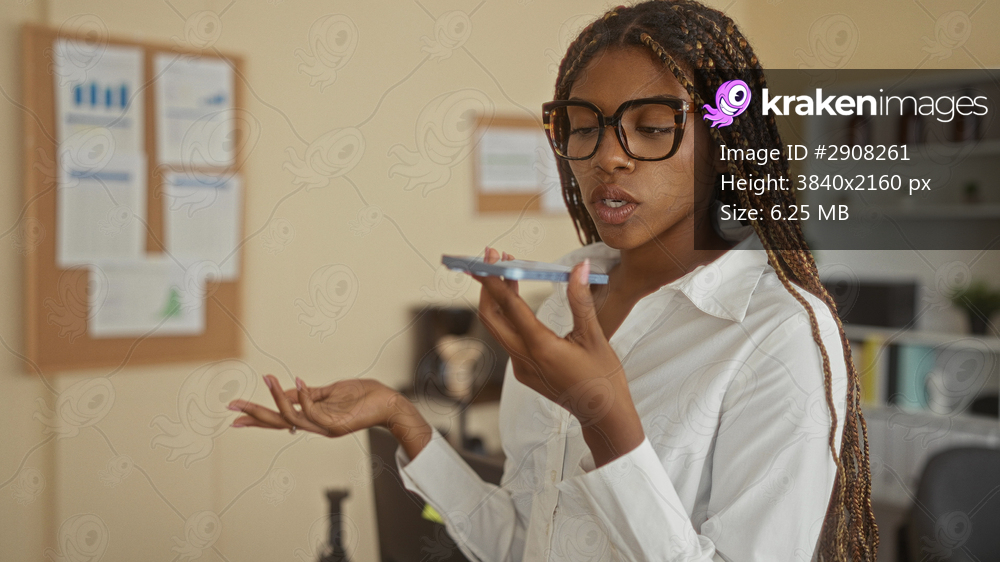 African american woman speaking into smartphone in office with hand raised and eyes closed listening pose; thoughtful focus.