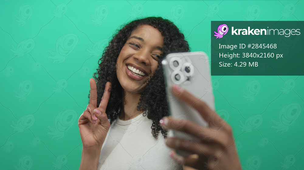 African american woman takes selfie with smartphone and flashes peace sign in studio; happiness.