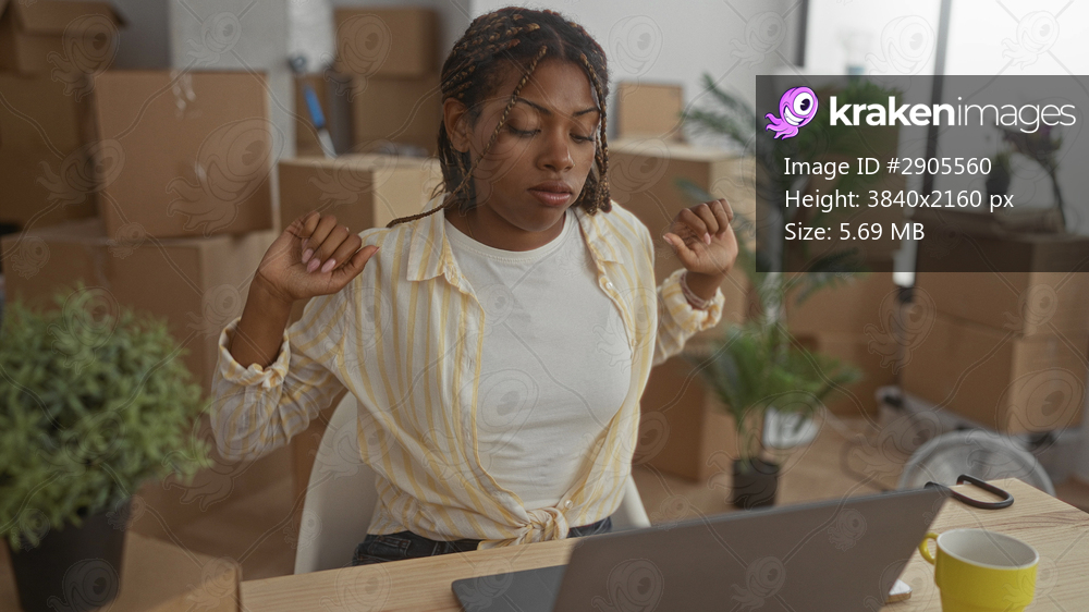 African american woman typing on laptop among cardboard moving boxes in building, glancing at wrist and gesturing with hands; focus moving day planning. - Kraken Images