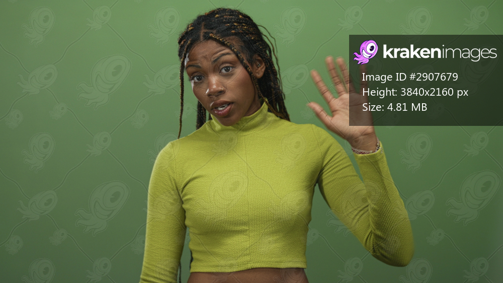 African american woman waving hand in studio against green backdrop wearing lime crop top and braids showing open palm gesture; indifference.